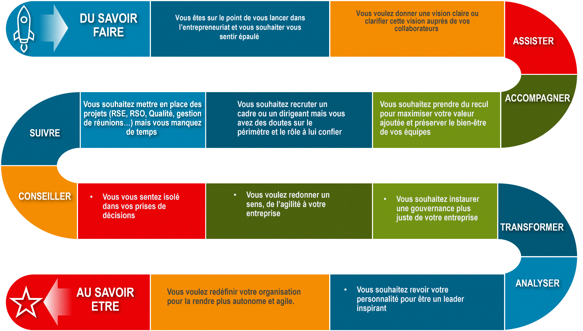 En tant qu'expert, je vous accompagne dans la reconnaissance de vos forces, faiblesses et dans la collaboration pour développer le chemin qui vous mènera au succès de manière durable tout en conservant les 2 principales composantes de la réussite L'HUMAIN & LA VALEUR AJOUTE des actions.